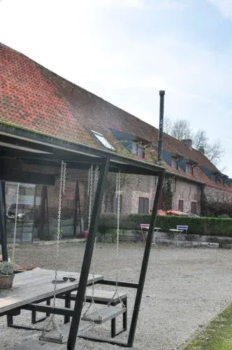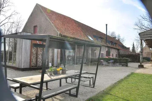 Historische hoeve van Gasthof Lophem met ruim binnenplein en zitplaatsen, een rustige plek voor bedrijfsevents en teambuildingactiviteiten in Loppem.