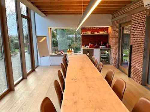 Er zijn meerdere ruimtes die je kan inzetten afhankelijk van je programma: een kleinere vergaderzaal, een polyvalente zaal, een overdekt terras en een overdekte schuur. Dat maakt het makkelijk om te schakelen tussen plenair, break-outs en informele momenten.