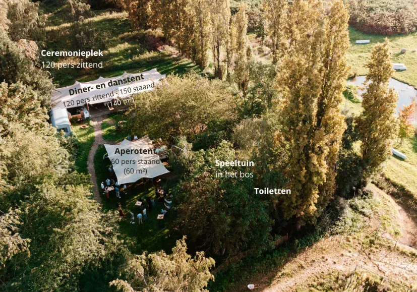 Luchtfoto van een buitenevenementenruimte met gelabelde ruimtes en een Oogsttafel tussen de bomen.
