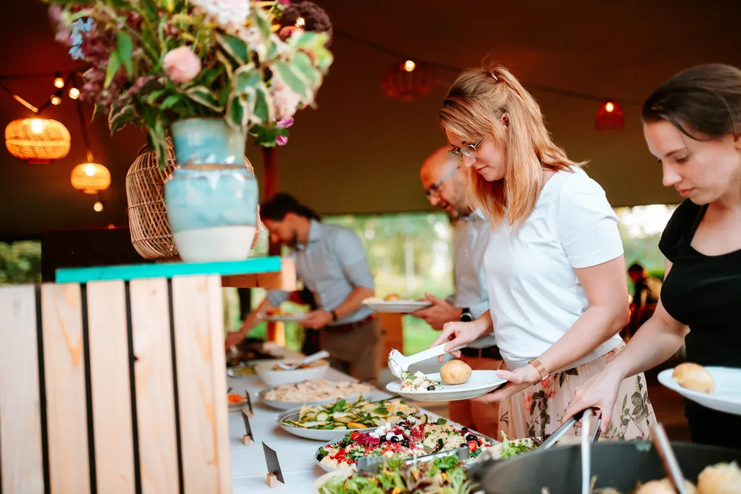 Wat Oogsttafel extra aantrekkelijk maakt als locatie voor teambuildings, is de combinatie van “buiten beleven” met comfort. Je hebt het vakantiegevoel van een outdoor venue, maar tegelijk de zekerheid van een sterk weerplan. Regent het? Dan zit je droog en warm onder de grote stretchtent met zijwanden en branders. Zo blijft je planning intact en hoef je niet last-minute te stressen.