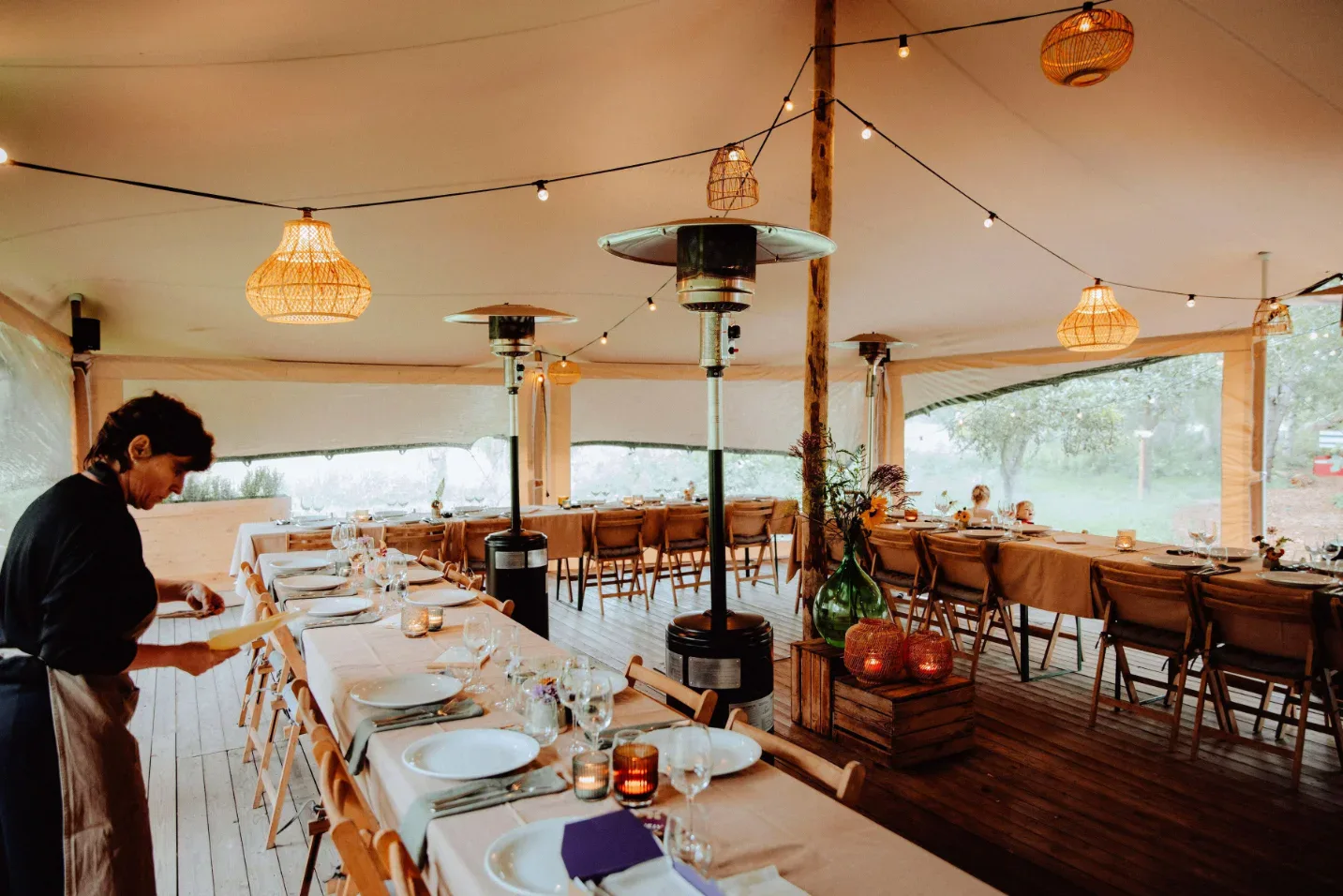 • Stretchtent als weerzekere oplossing met zijwanden en warmtebranders
