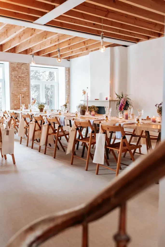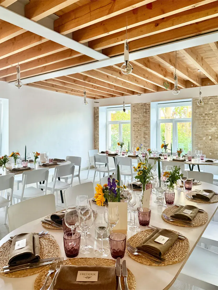 Stijlvol gedekte tafels in de zaal van Pastorie Leke Diksmuide met natuurlijke lichtinval en warme accenten